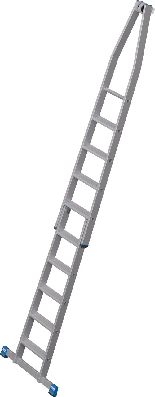 • A létra felső tagja fali vezetőgörgőkkel és kopásálló, puha gumi anyagú érintkező blokkal, ékkivágással, mely házsarkokra és ablakprofilokra helyezhető.